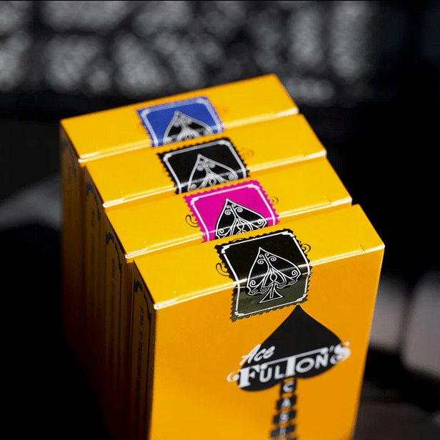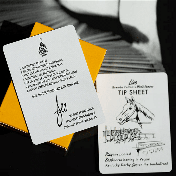 This is it. The ORIGINAL Ace Fulton’s Casino as rendered by Dan Phillips. This was the first approved back design. These almost went to press in 2012 but were halted and refined into the version that spawned an entire genre of playing cards. This rendition of Ace is IDENTICAL to the original vision–including LONG FLAPS on the tuck a la 1970s Vegas. Deep blacks on a vibrant 037 Orange–specially formulated for this deck.
