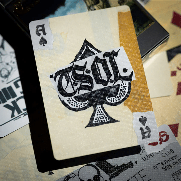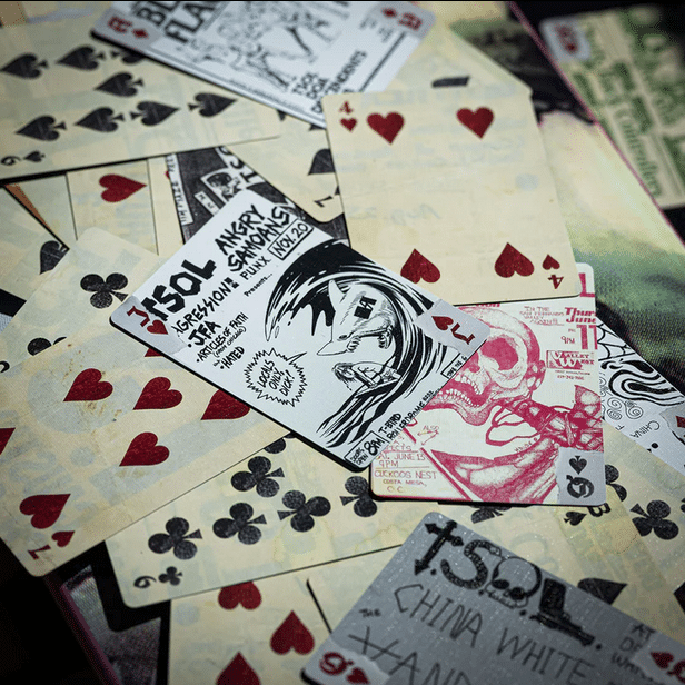 This official deck of cards is completely custom. Every card is meticulously curated and designed to pay tribute to a bygone era where flyers were the advertisement of choice to spread the word. This deck features flyers from the archives of legendary skateboard artist Chicken Deck who collected them from 1979-1983 around Orange County California.