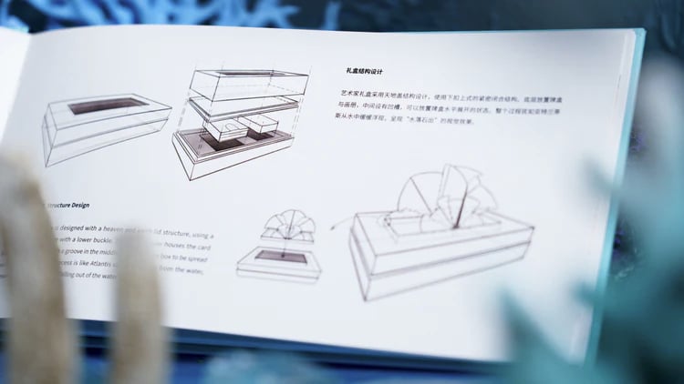 The gift box is constructed with a canopy design that utilizes a tight closure with a bottom snap top. The bottom layer holds the deck and album, with a groove in the center to hold the deck in a horizontally unfolded state.