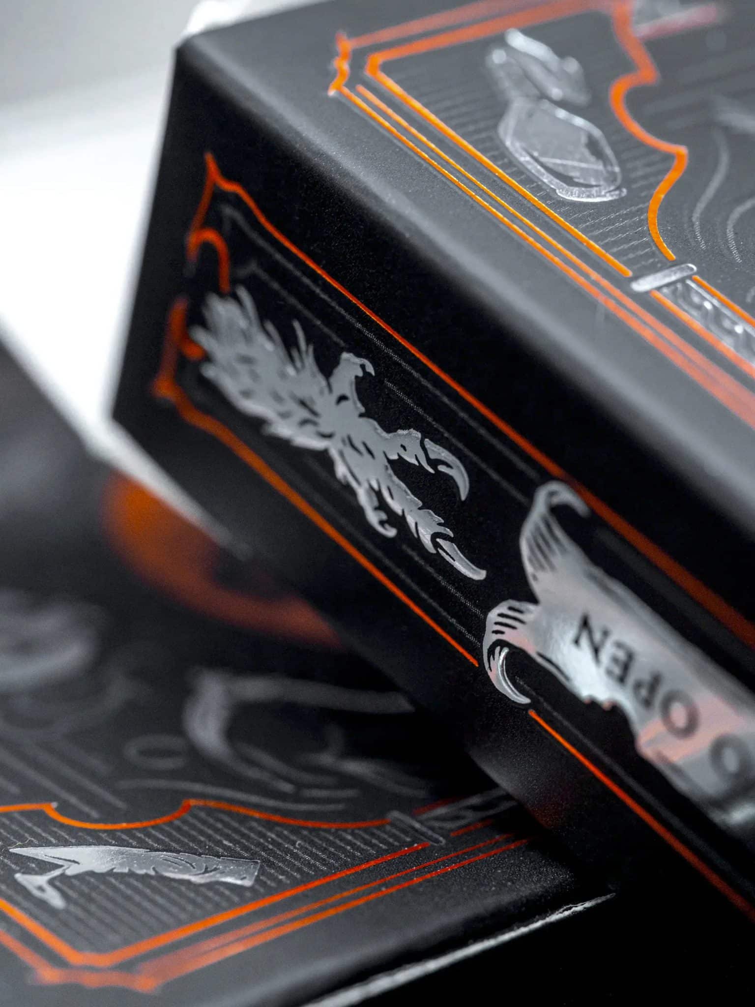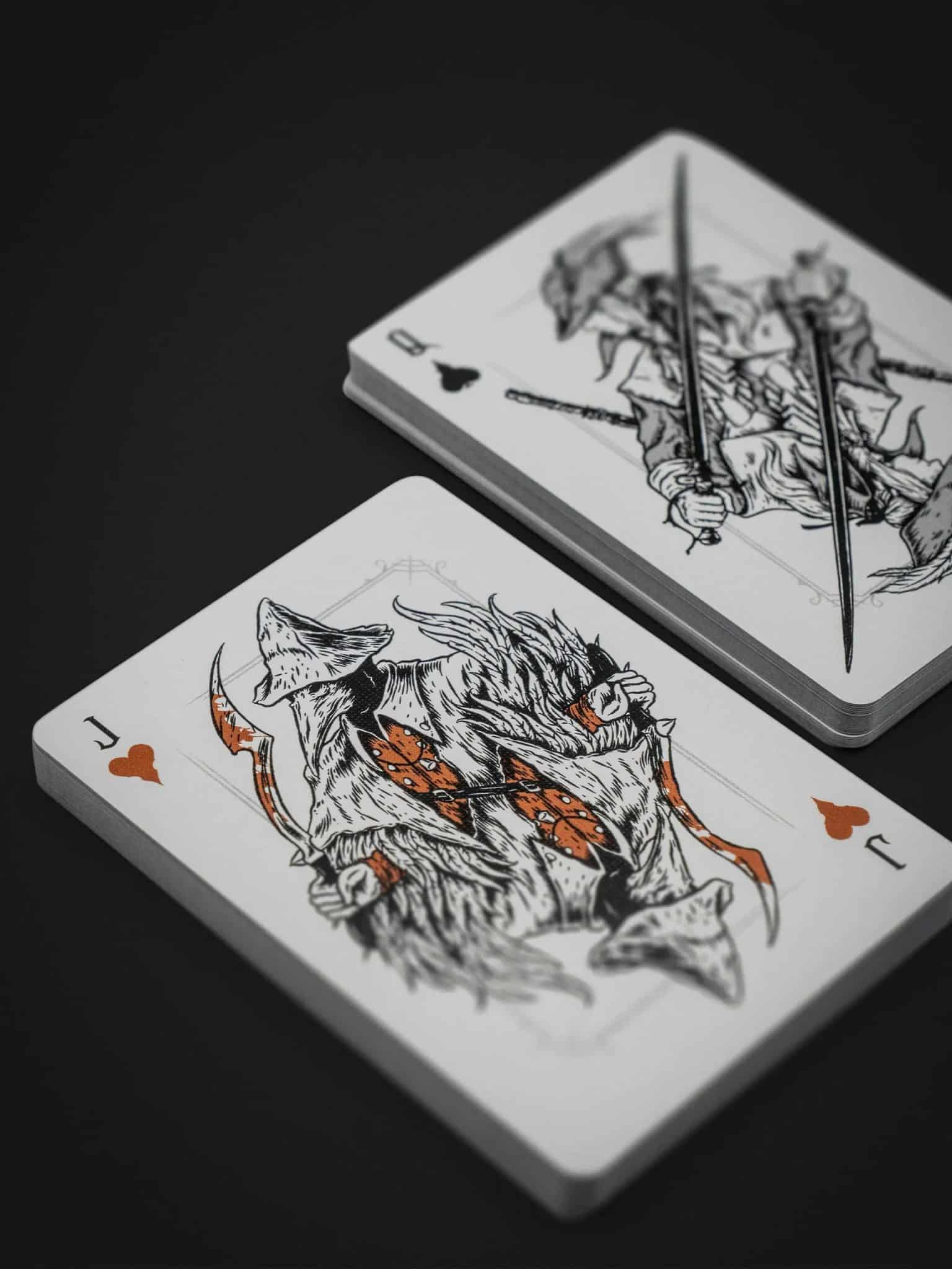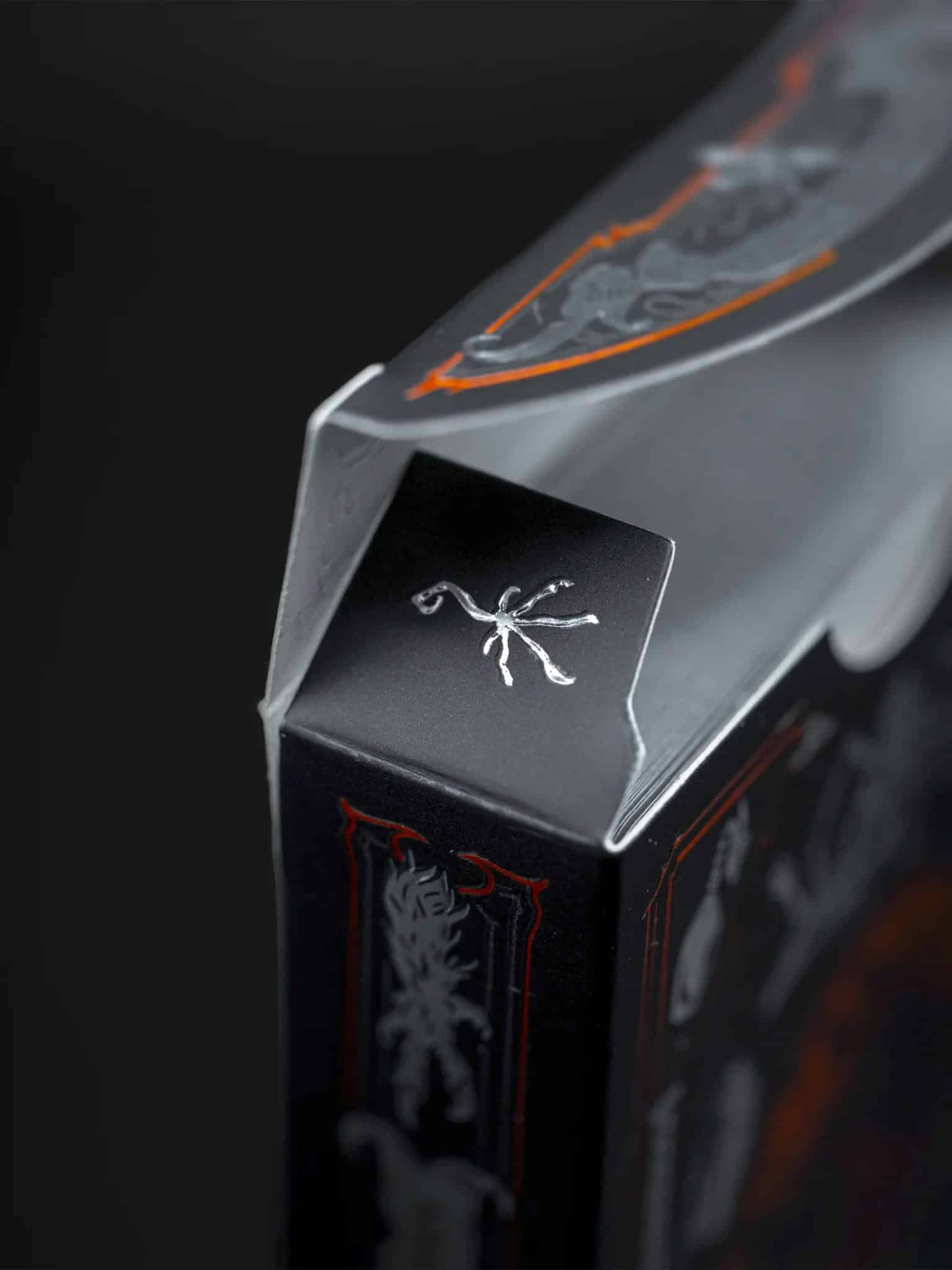A playing card deck born of eldritch nightmare, draped in blazing orange foil and haunting silver detail. The Bloodborne Playing Cards celebrate the cursed city of Yharnam with an intricate illustrative design steeped in gothic horror.