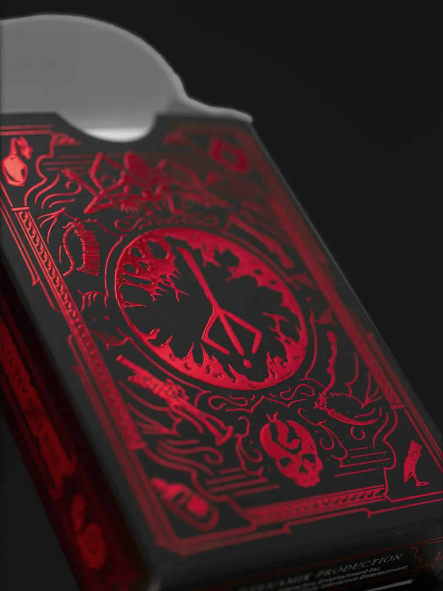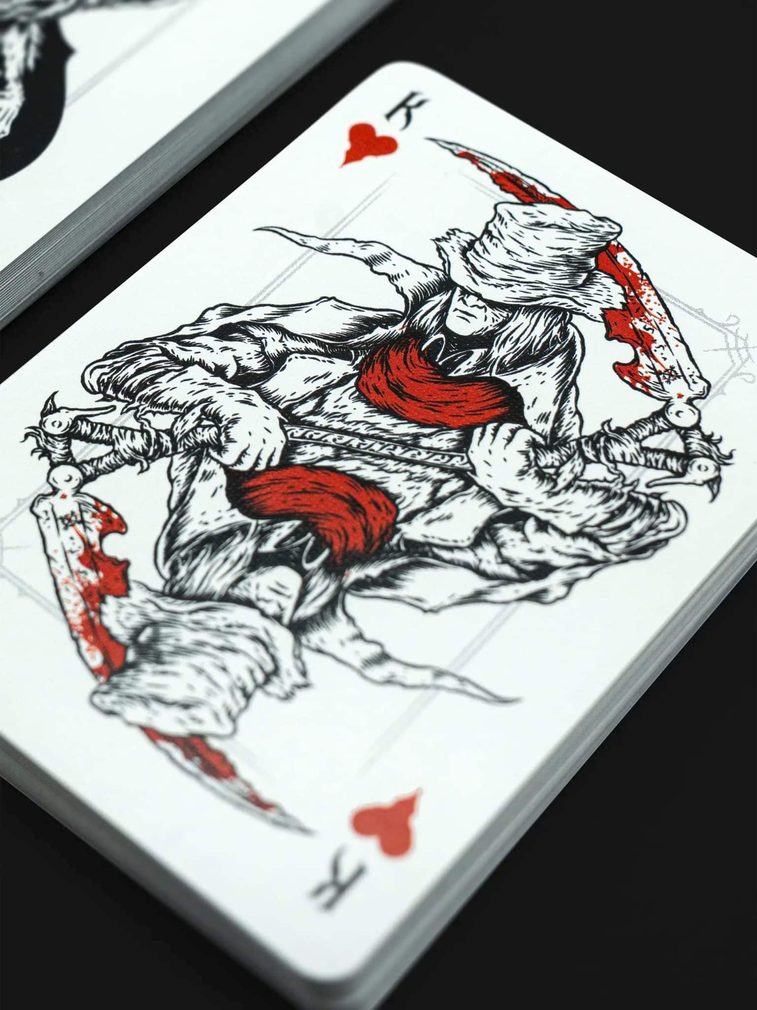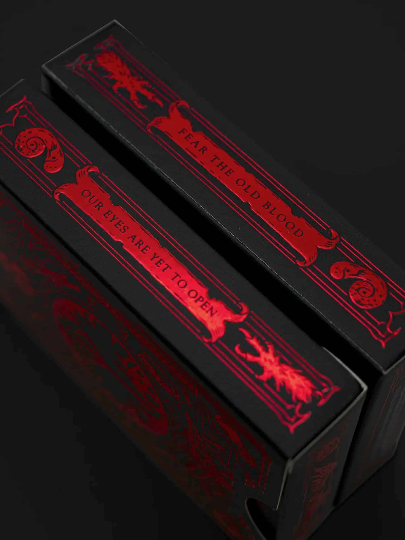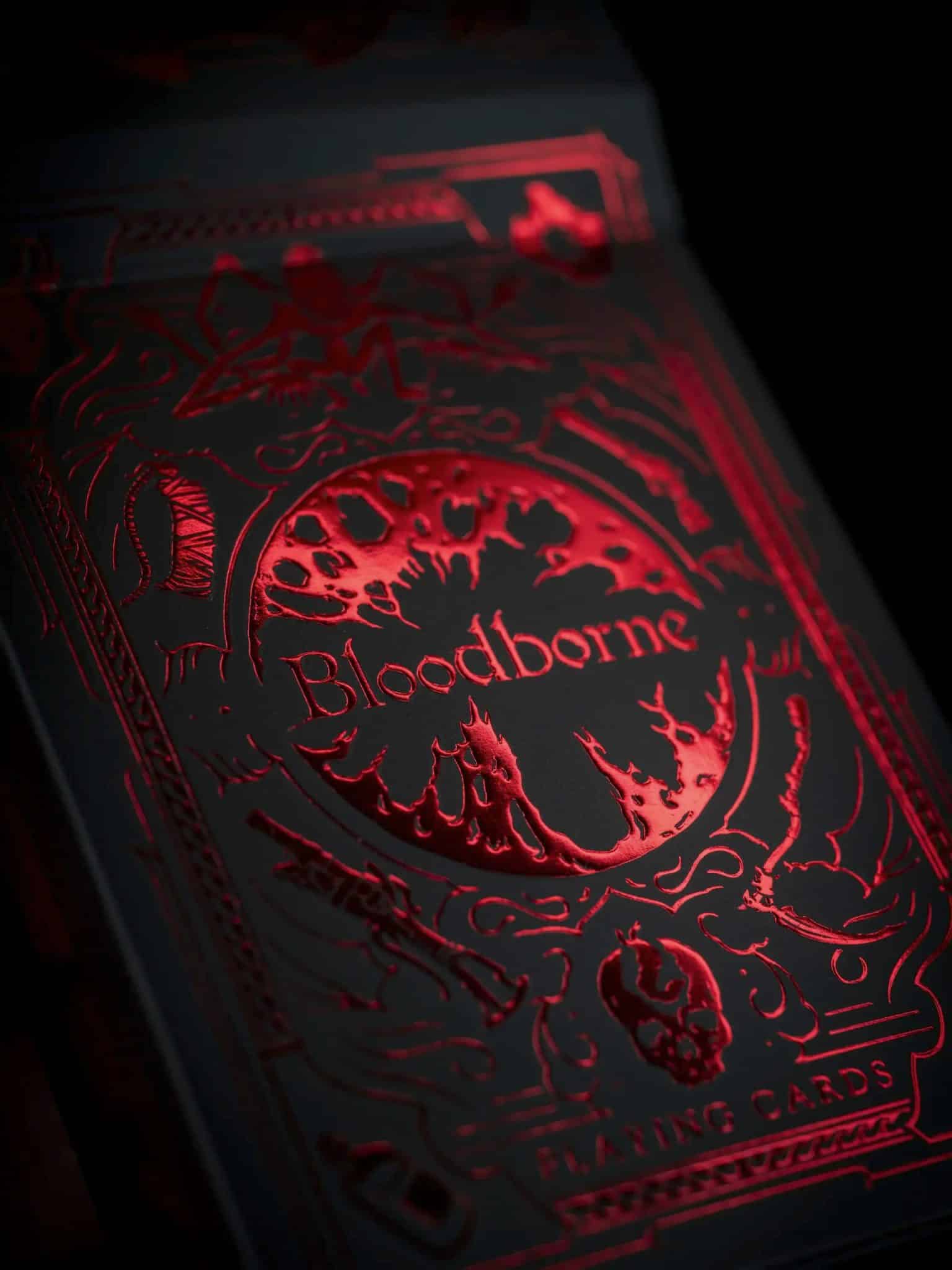 A playing card deck born of eldritch nightmare, draped in bloody red foil. The Bloodborne Playing Cards celebrate the cursed city of Yharnam with an intricate illustrative design steeped in gothic horror.