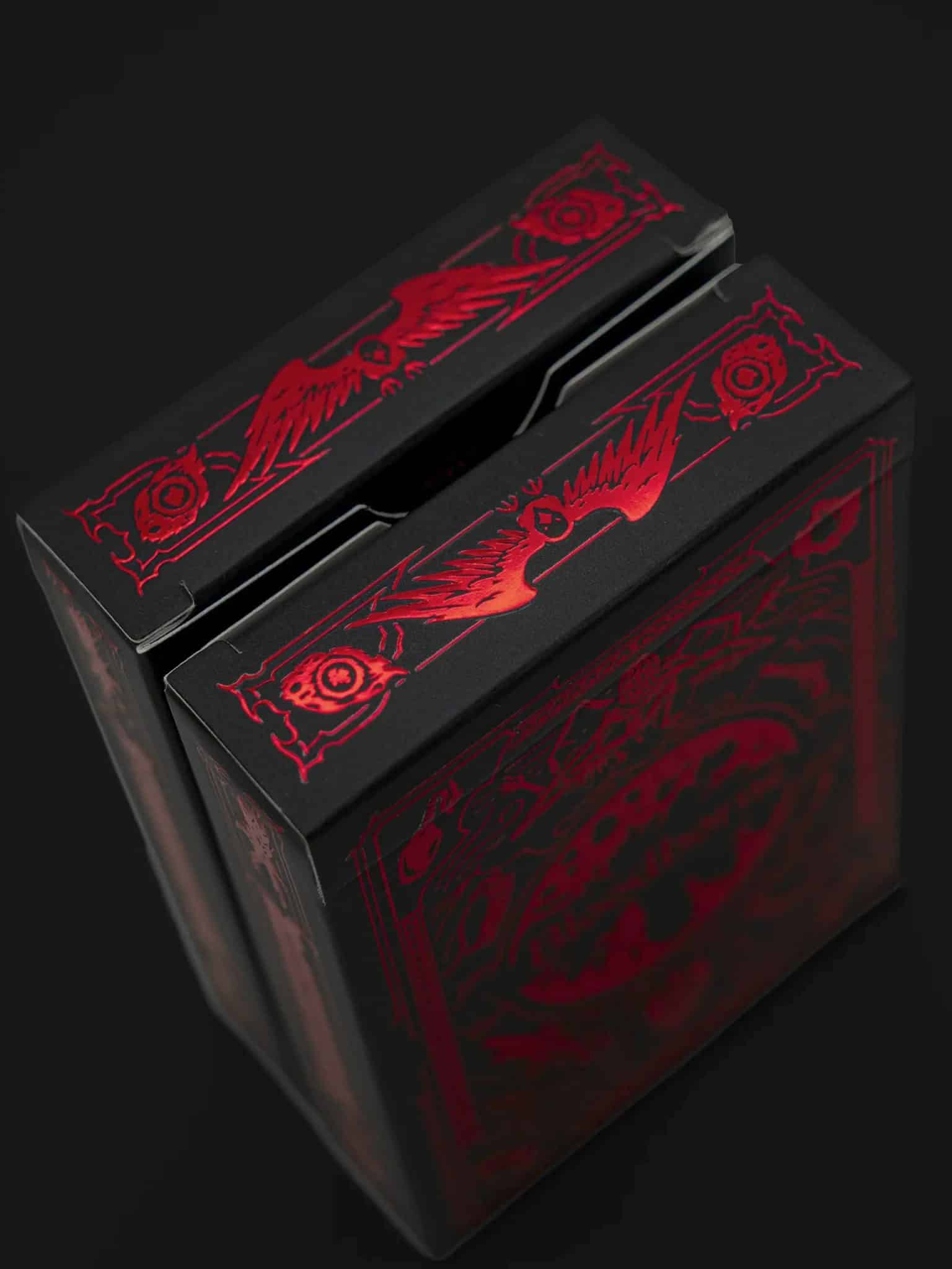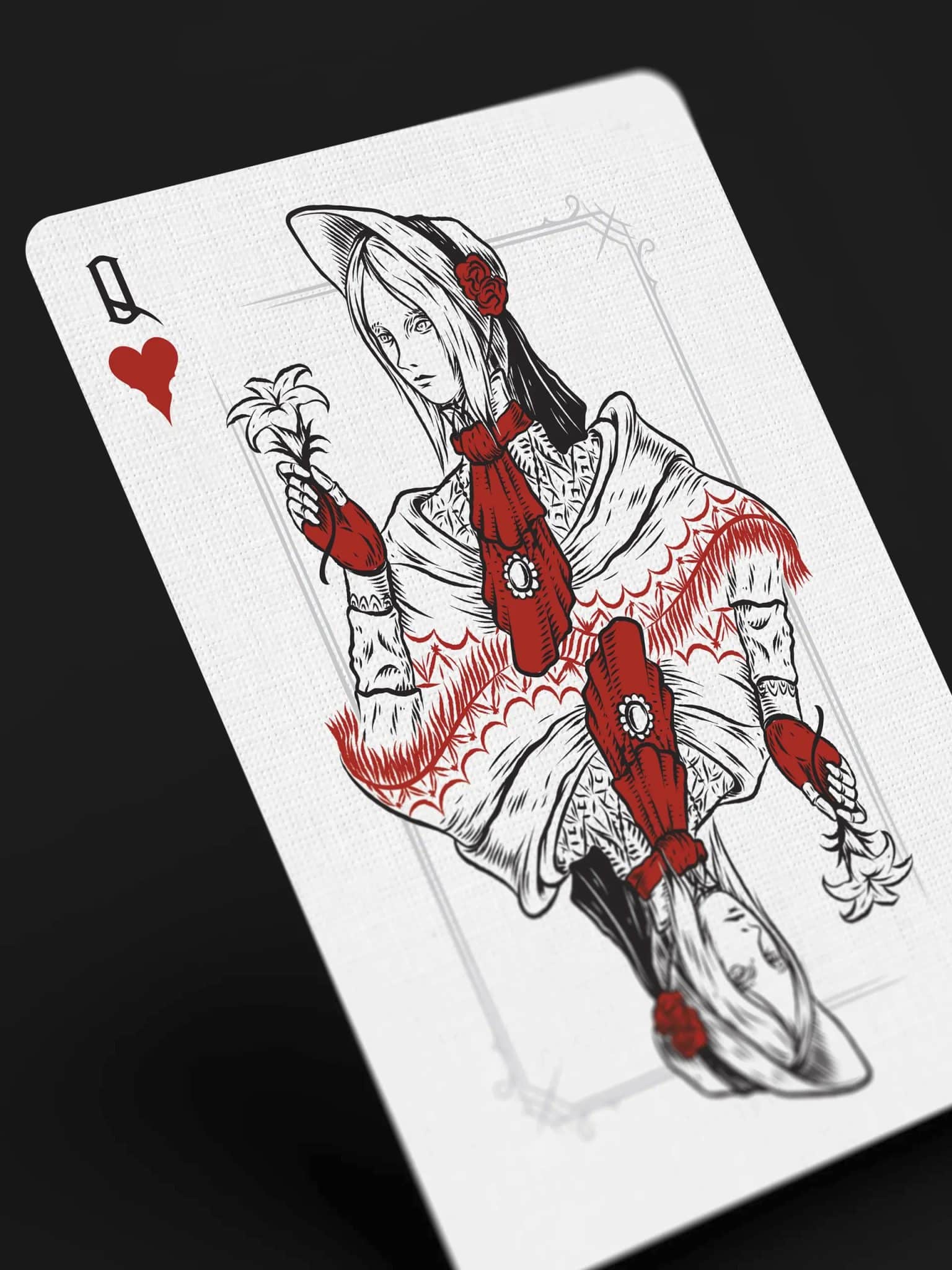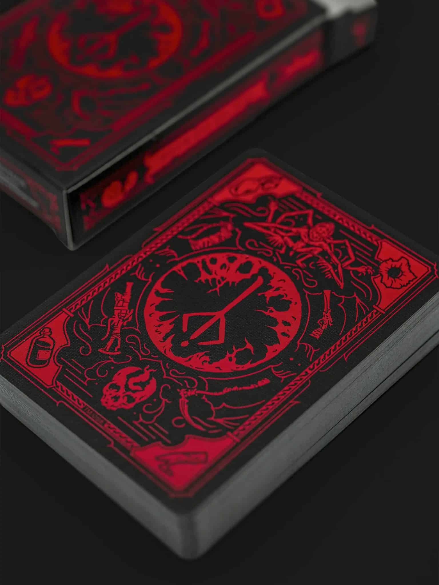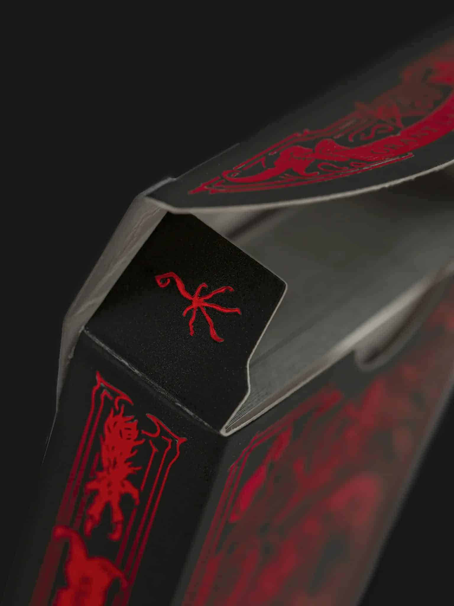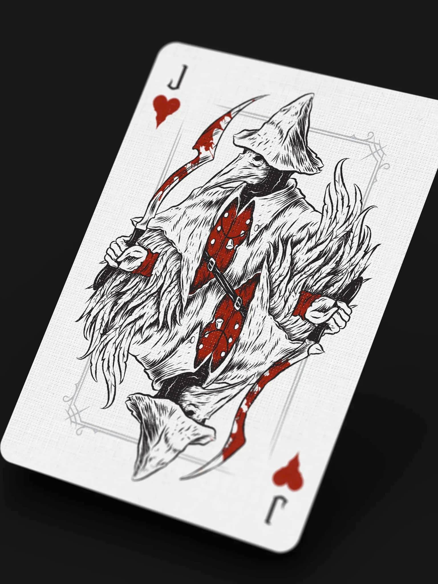 A playing card deck born of eldritch nightmare, draped in bloody red foil. The Bloodborne Playing Cards celebrate the cursed city of Yharnam with an intricate illustrative design steeped in gothic horror.