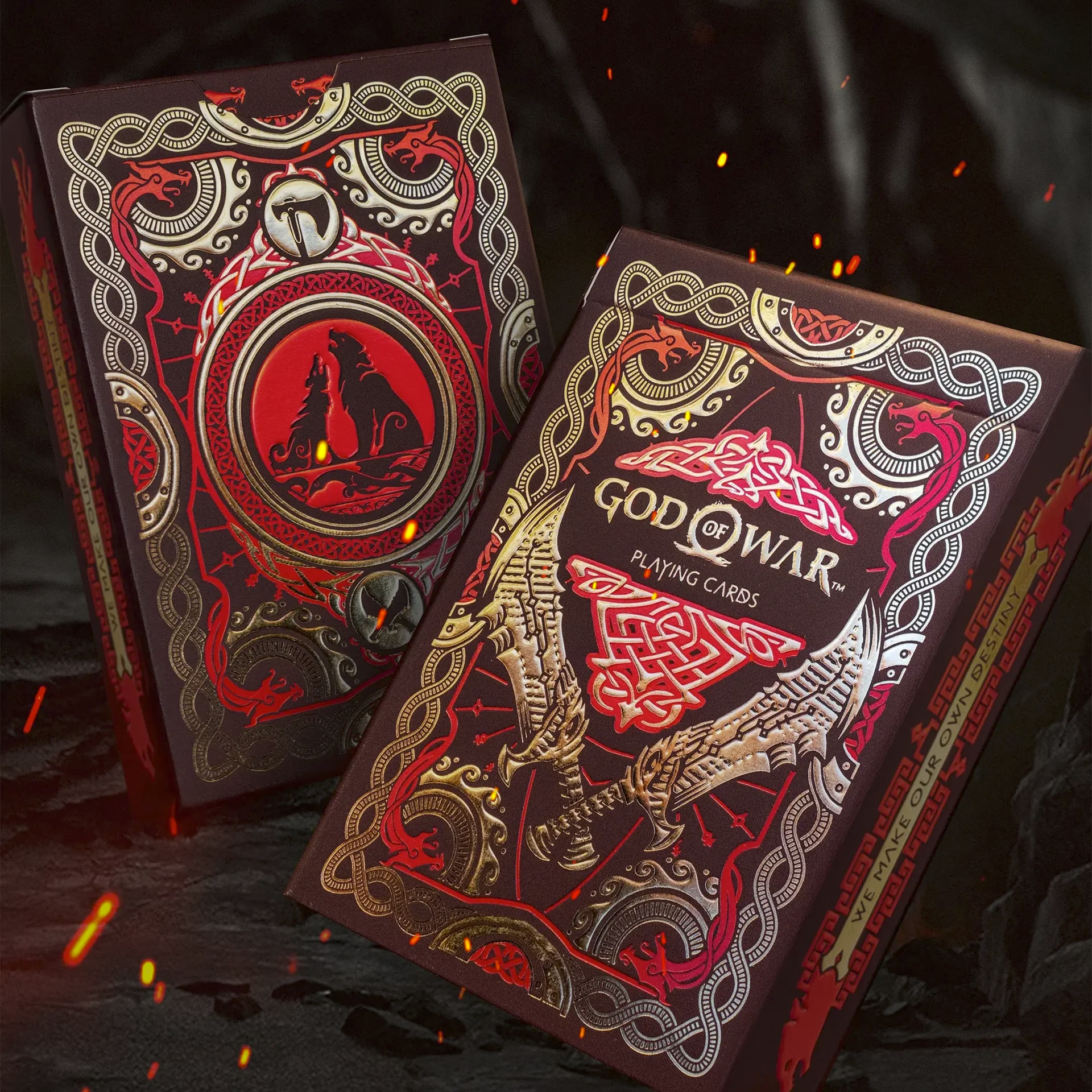 A playing card deck forged in the fires with red-hot foil and luxury gold details. The God of War Playing Cards: Blades of Chaos Edition celebrates Kratos’ iconic dual-chained swords with an intricate illustrative design.
