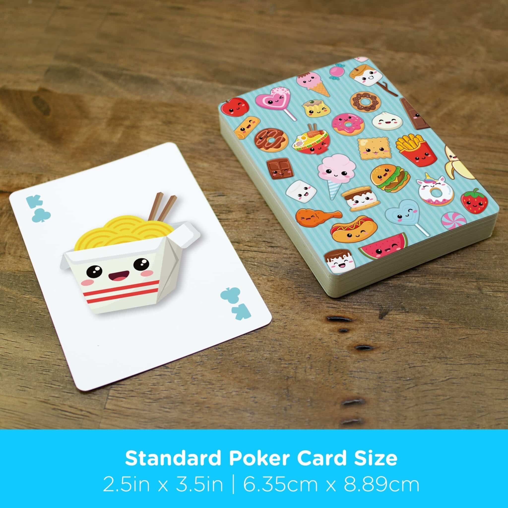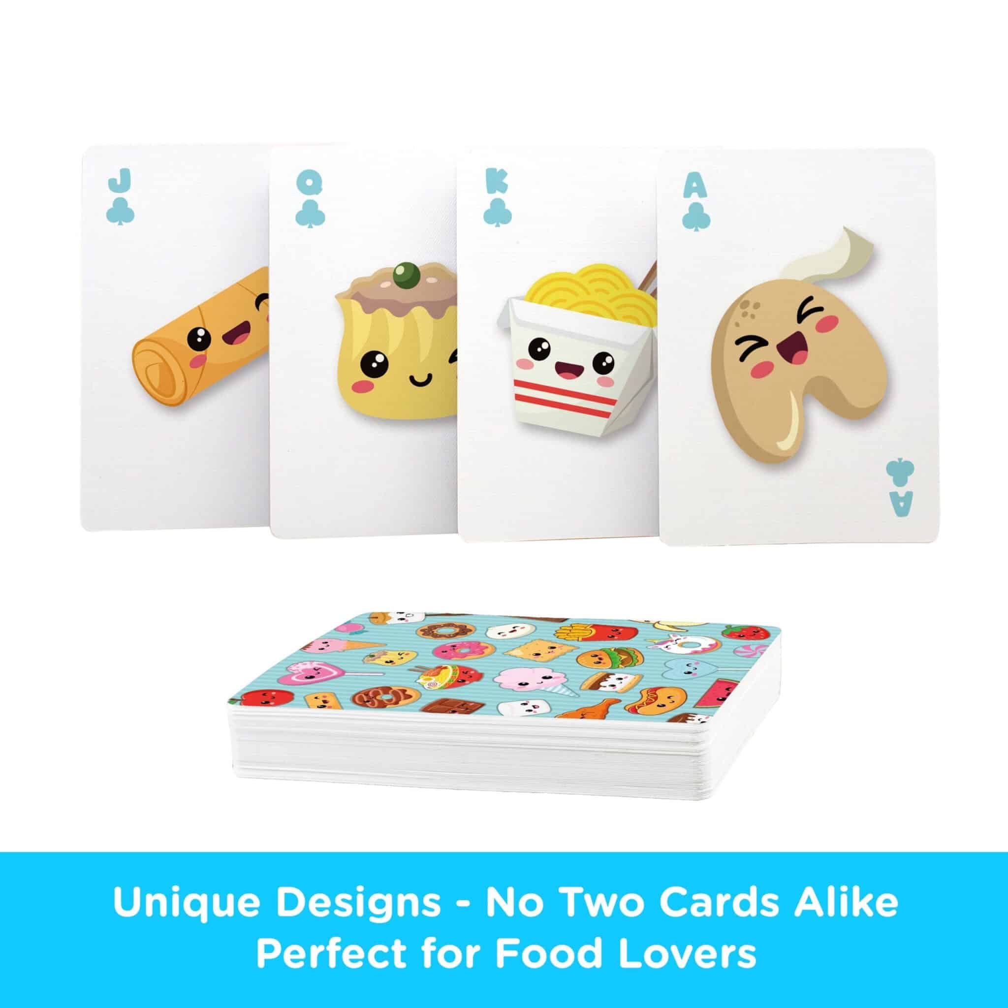 PLAYING CARD DECK INCLUDES MULTIPLE IMAGES: This Kawaii Foods deck of playing cards includes multiple images. It’s loaded with imagery and designed for fun for fans and players alike.
