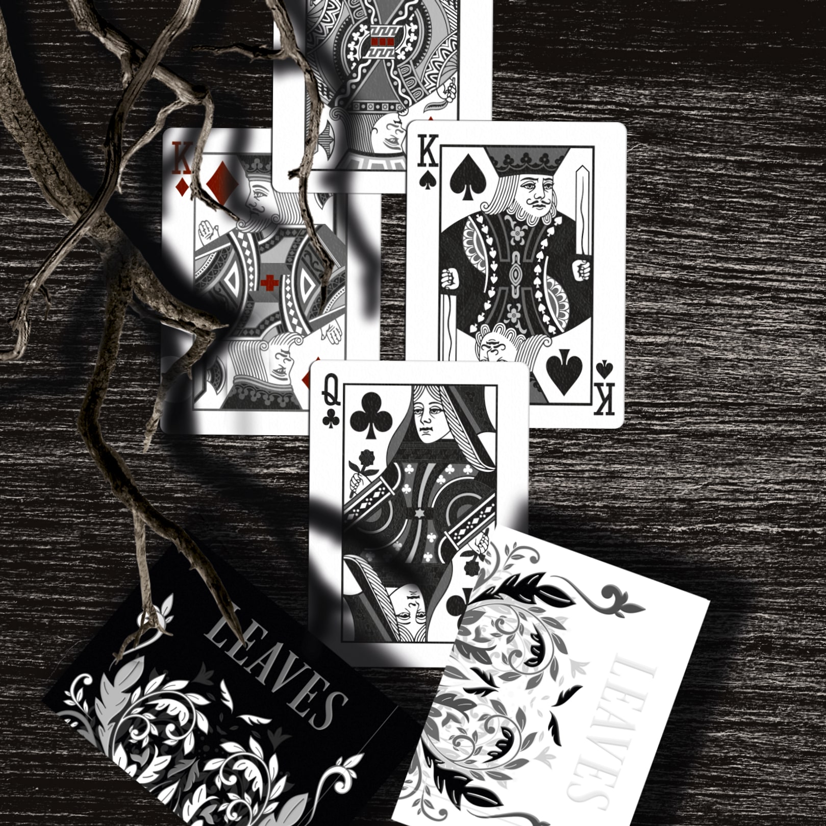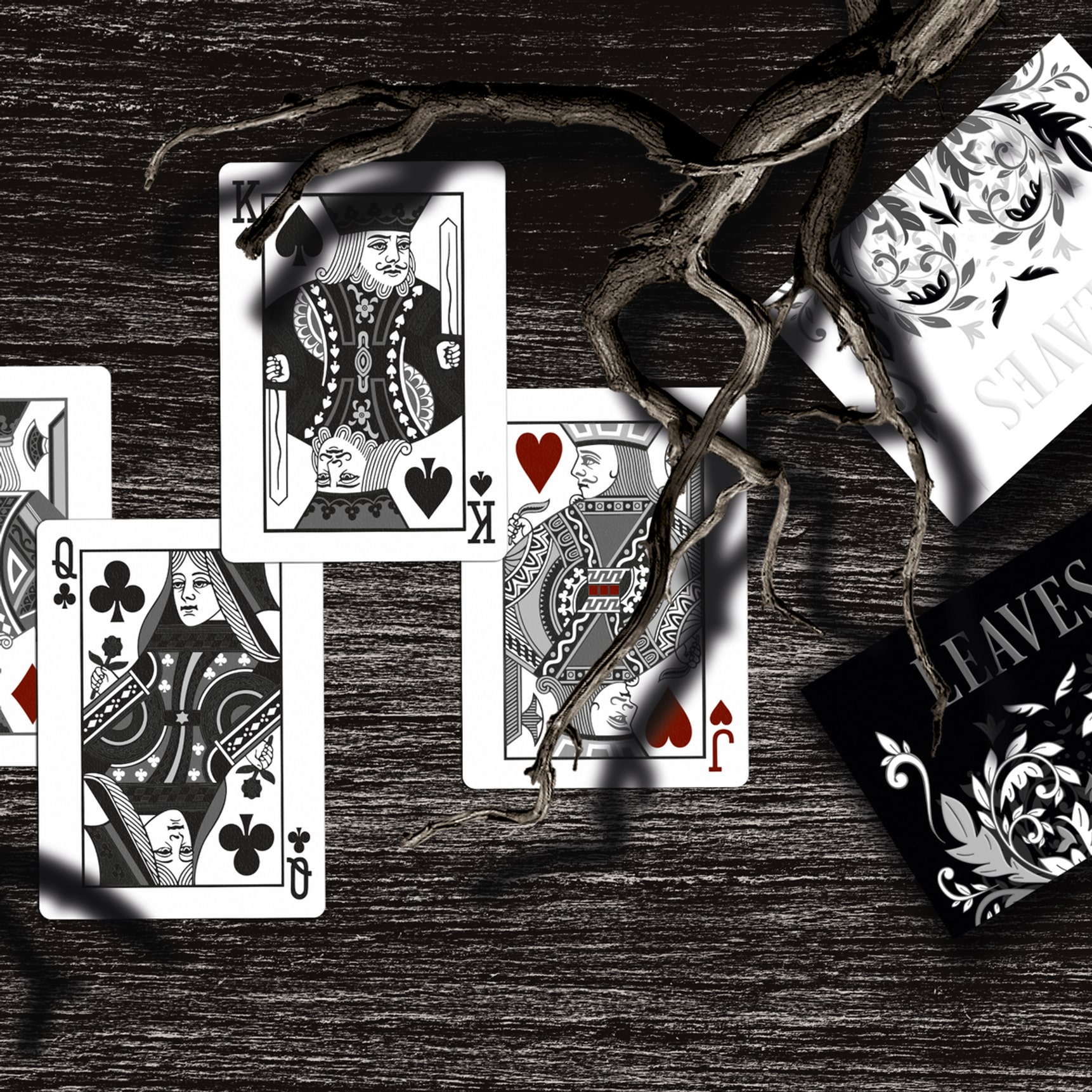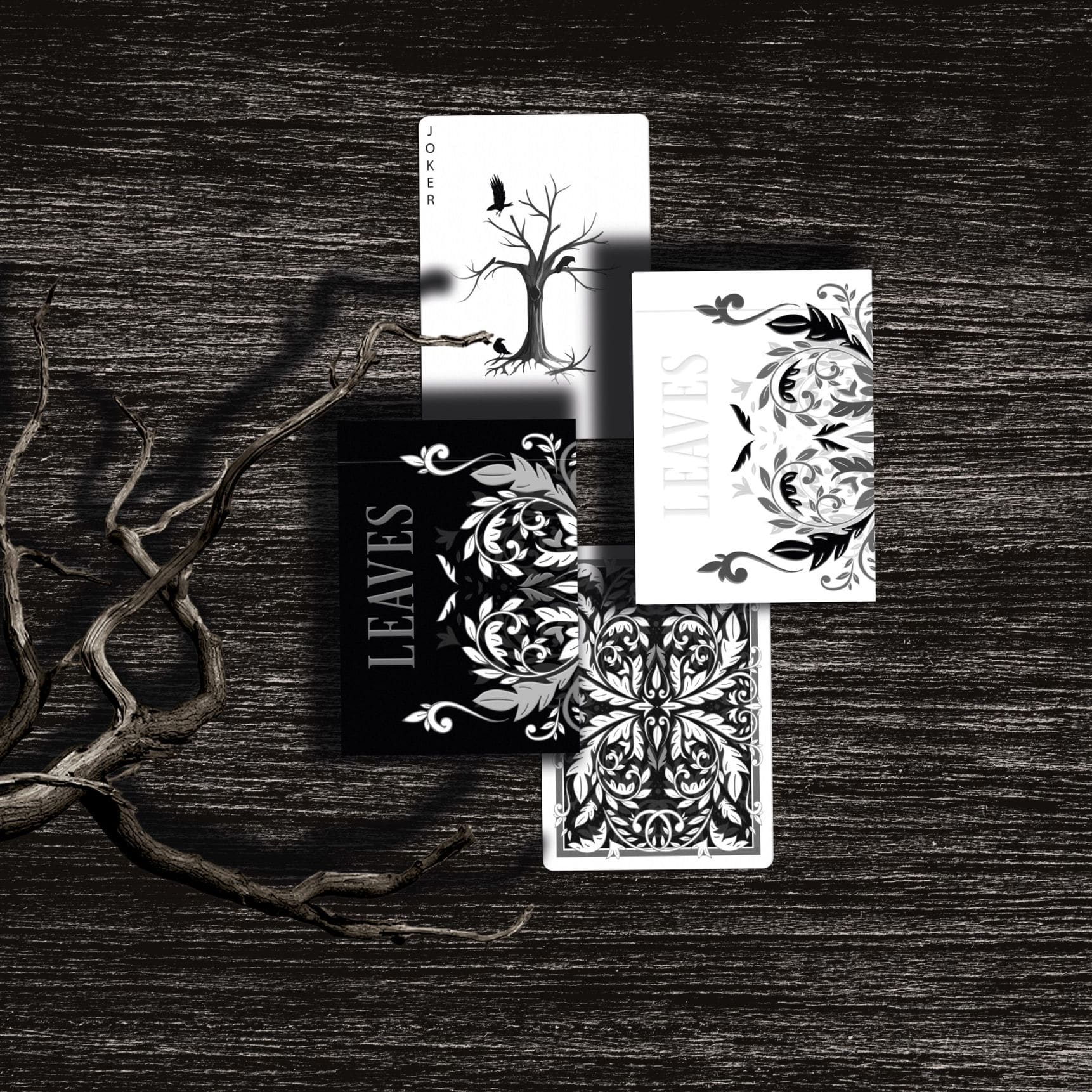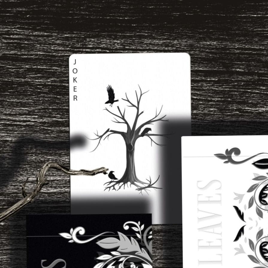 For this deck the WJPC used vegetable-based inks, each card is printed on sustainable forest paper and finished with starch-based laminating. All decks come inside a tuck box made out of recycled paper. We closed the tuck securely with a custom paper seal. Leaves playing cards are 100% recyclable and contain no plastics at all.