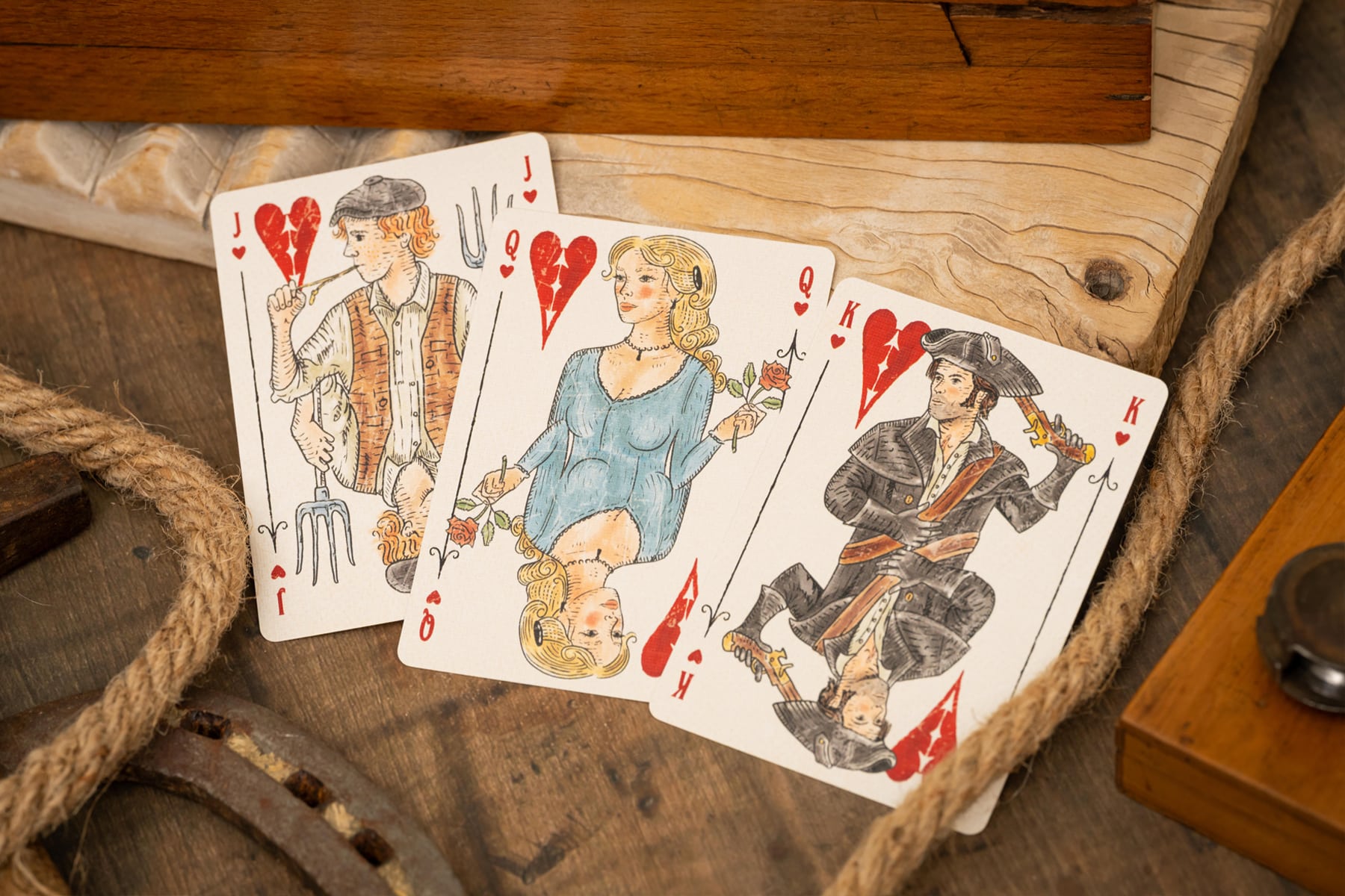 The court cards are painstakingly drawn as the characters who reside in and around Fairhurst Manor in 1800s Lancashire, and have been drawn in such a way as to reflect the posing of classic, standard court cards of the English pattern.