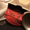 From grotesque gargoyles to mournful statues, the sides of this box tell a tale of silent guardians and enigmatic presences lingering in the hallowed quietude of a mausoleum. Yet, the interior, as you pry open this relic’s secrets, unfurls an unexpected contrast. A luminous revelation awaits within – a bright red foilthat ignites the darkness within. At the heart of this crimson blaze, winged creatures take flight, a mesmerizing symphony of shadow and scarlet. With each undulation of the box’s lid, these ethereal beings soar from the center, as if escaping the confines of stone and ink into the vibrant realm beyond.