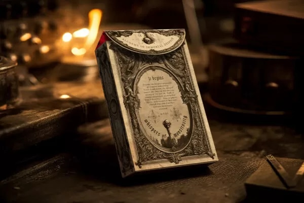 The Nocturnal edition tuck box is a relic born of an ancient and weathered paper stock that whispers tales of forgotten epochs. This timeworn parchment, bearing the scars of ages past, cradles the inked vestiges of an unholy communion with the macabre. Each of its sides is gracefully embossed and adorned with a gothic collage, an amalgamation of menacing gargoyles and statues, wrought in the somber embrace of mausoleum shadows.