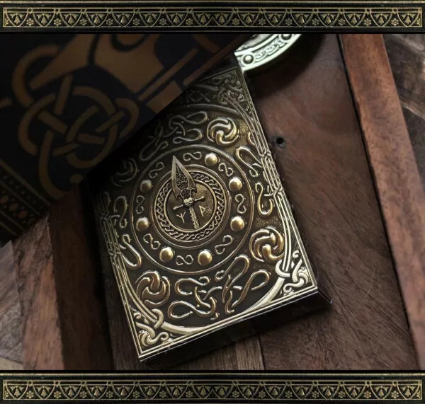 The tuck back features Odin’s powerful and magical spear, Gungnir, in the center of a glorious, shining and strategically embossed artwork, which take direct inspiration from real Norse treasure and jewelry found by Danish archeologists.