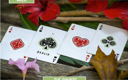 Each part of the deck refers to the leaves of the oxalis, whose special shape is repeated several times in both the box design and the cards, particularly the pips are leaf-shaped, trying to remain a clean and recognizable design.