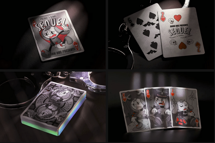 Each number card features atypical pip placements, which are adorned with 4 unique motifs representing the suits. Each motif reflecting the harsh and morbid themes of the darker films produced by studios.