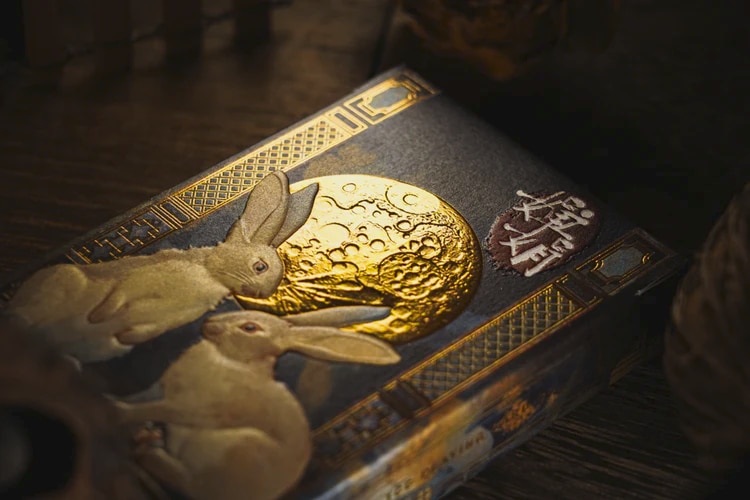 The tuck box features embossed gold foil craftsmanship, beautifully capturing the two clever and lively jade rabbits, gracefully leaping under the moon. Against the deepening night sky, lush golden osmanthus trees, Chinese-style border patterns, and a special Mid-Autumn seal combine to create essential symbols of Mid-Autumn culture.