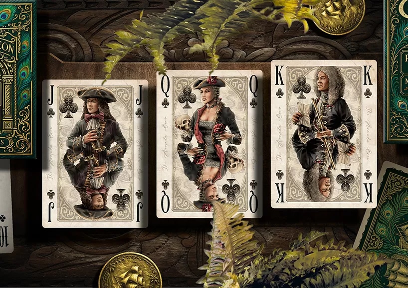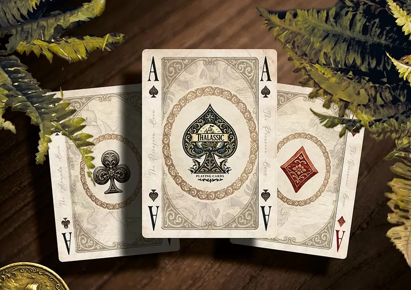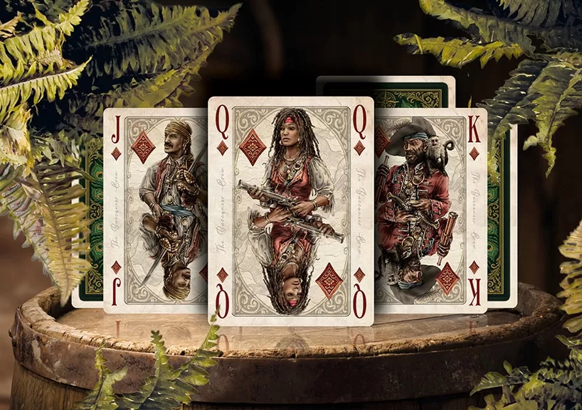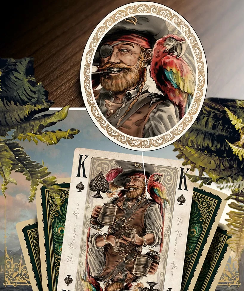 The courts of Thalassic feature 12 iconic pirate characters. Where the courts are identical in the two editions the jokers, card backs and aces are completely unique for each edition. Furthermore, the face cards have unique designs, allowing for an art variant in The Blue Lagoon and a classic two-way design in The Green Galleon edition.