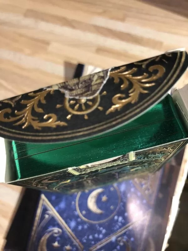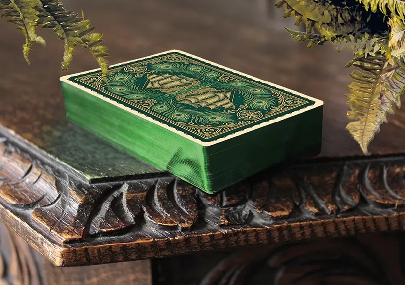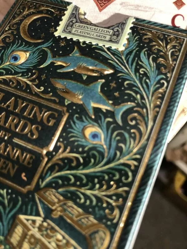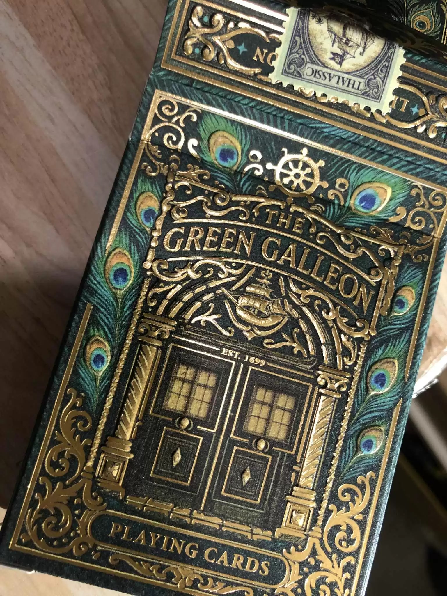 The Green Galleon features an extravagant pirate pub theme in green and yellow tones, with many details and accents in embossed gold foil. This edition has green-gilded edges on the cards to represent the magical touch of peacock feathers and lavish oceanic shine of tropical islands.