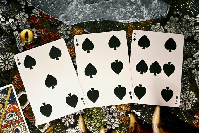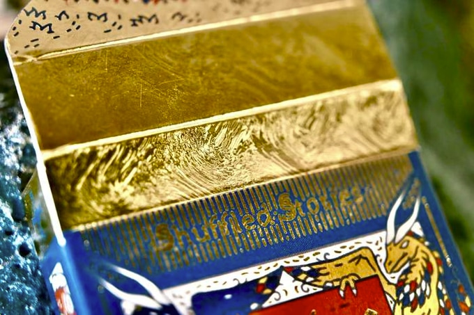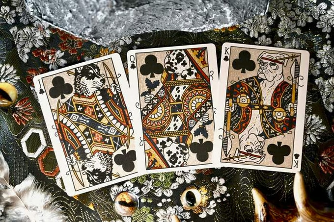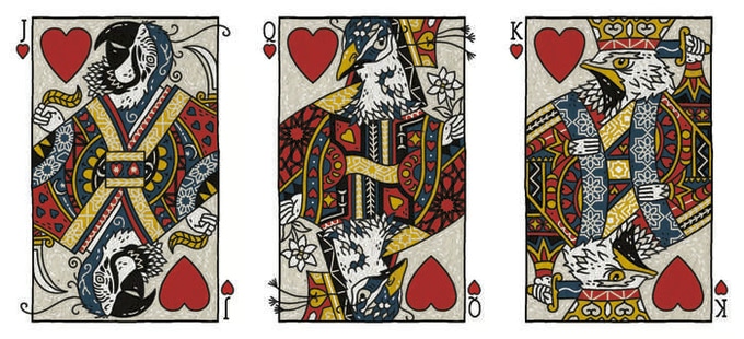 The jokers are very personal. The two jokers represent my two boys – a robin for my Robin, and a tyrannosaurs rex (king of the dinosaurs) for our King Arthur. Two ad cards form a diptych creating the intricate Dapper Menagerie emblem! The back design, developed with extensive feedback from Patreon members, shows our four animal suits hidden not unlike the original Culturae Animalis. The pallet is woven in a shape reminiscent of the Union flag, representing my English roots. The strong colours and divisions produce a brilliant fan!