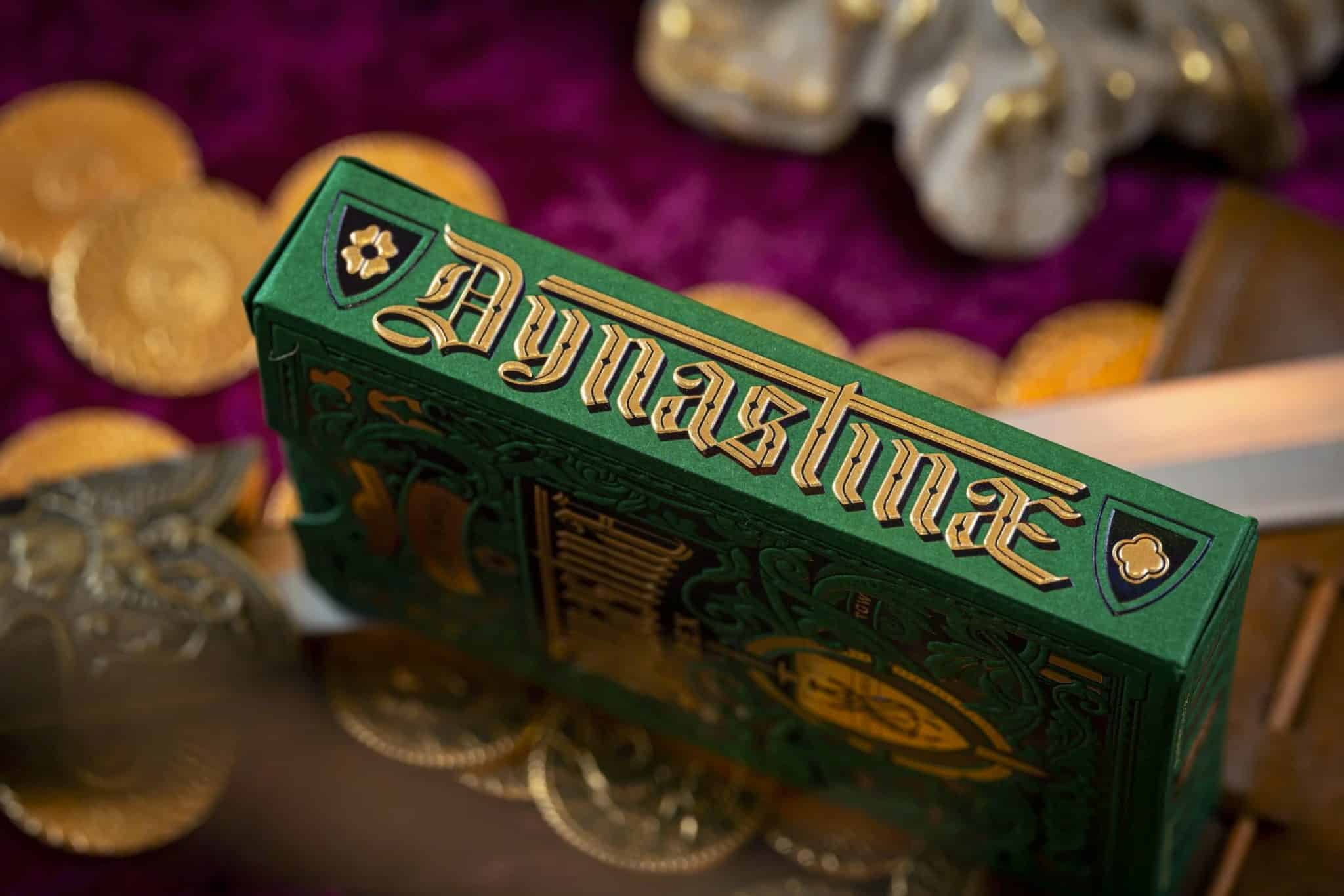 The Dynastinae Rex Limited Edition continues the tradition of the fabled luxury Green and Gold decks of the TGW line. The Dynastinae Rex has a distinct tuck case, featuring Gold and Black Holo foil embossed layers, printed on the highest quality green cardstock. The cards within are gold gilded and include a unique Successor ambigram back design adorned in beautiful gold cold foil, contrasting with deep green and black. The faces of the cards are also printed with gold and silver cold foil. The Dynastinae Rex includes a custom numbered seal.