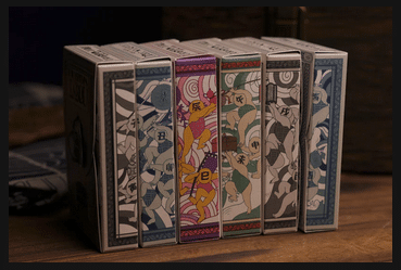 The card backs of the Urashima Tarou Origami Editions are a tribute to the elegance of simplicity and the heart of the tale. Featuring a minimalist design inspired by the intricate patterns of a sea turtle’s shell, each back is rendered in a single, bold color.